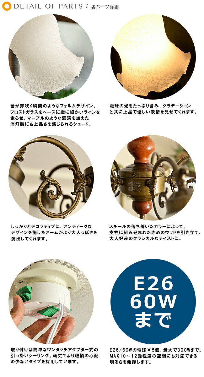 シーリングライト 5灯 シャンデリア リビング用 食卓用 ダイニング用 居間用 アンティーク クラシック フレンチ プルスイッチ 点灯切替 おしゃれ 照明 [INGRID:イングリッド] 寝室 ガラス ウッド 可愛い 10畳用 8畳 6畳 子供部屋 レトロ リビング照明(2-2