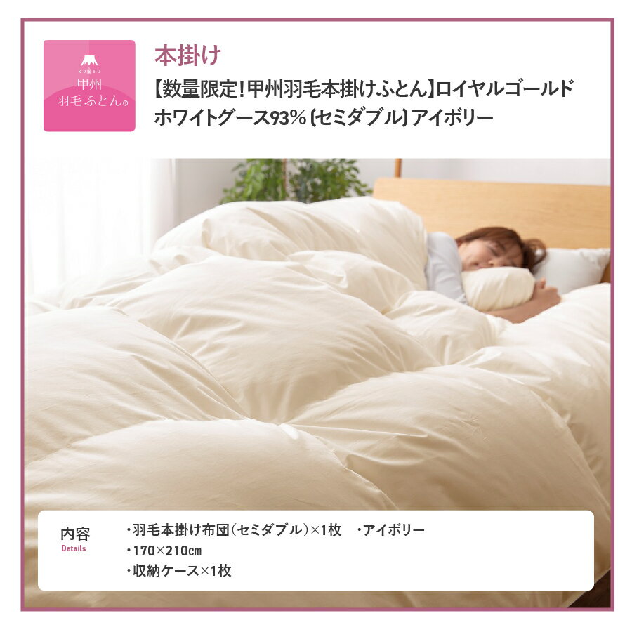 甲州羽毛ふとんは、三冠達成!!(※日本トレンドリサーチ調べ) ・欲しい羽毛ふとんNo.1 ・羽毛ふとん品質満足度No.1 ・羽毛ふとん口コミ満足度No.1 〜【今だけ限定】「ロイヤルゴールド」ホワイトグース防ダニ羽毛布団〜 【今だけの限定企画品】 世界遺産「富士山」の麓で作られた高級羽毛本掛けふとん。