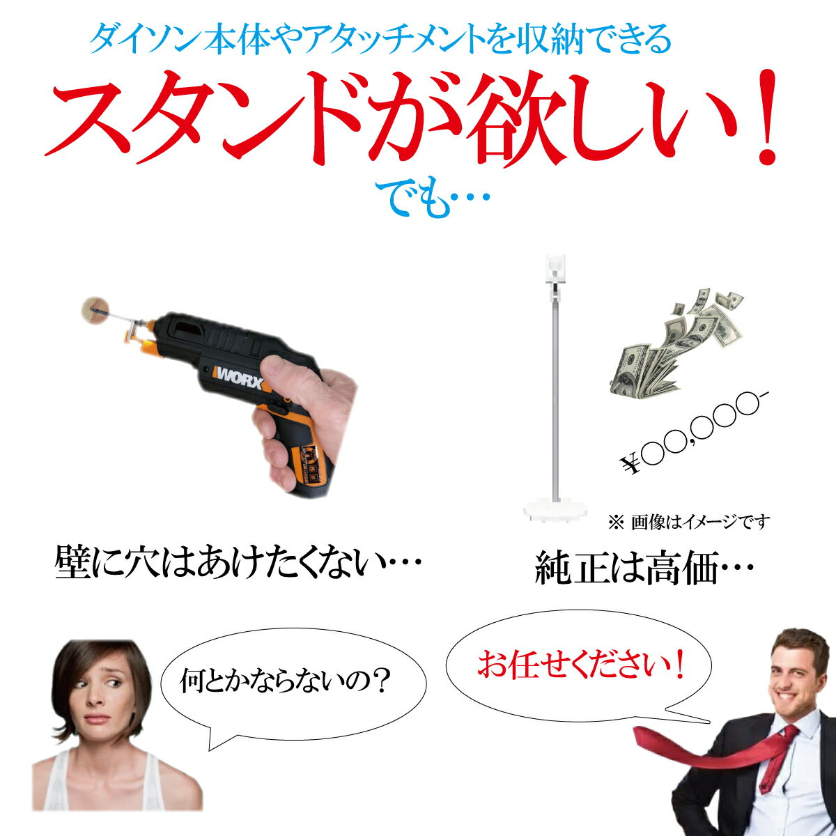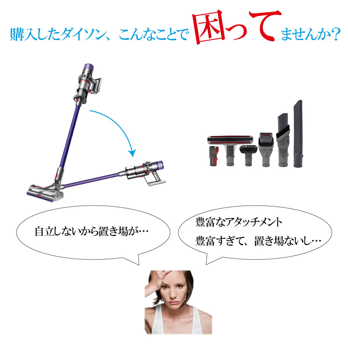 そこで!・ 自立式・ 壁の穴あけ不要の掃除機スタンドをご用意しました!各種アタッチメントもおしゃれに収納できます。