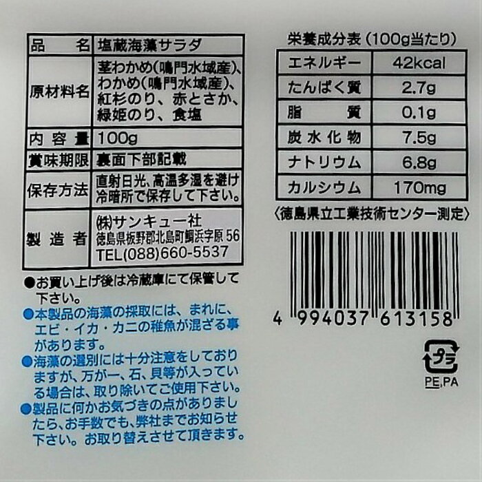 商品説明品名海藻サラダ(塩蔵タイプ) 原材料名茎わかめ(鳴門水域産)わかめ(鳴門水域産) 紅杉のり、赤とさか、緑姫のり、食塩内容量300g賞味期限 別途商品ラベルに記載。