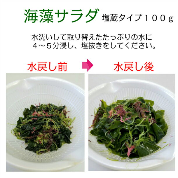 水洗いした後 約5分水に浸して塩抜きするだけで シャキシャキのフレッシュな海藻サラダになります。